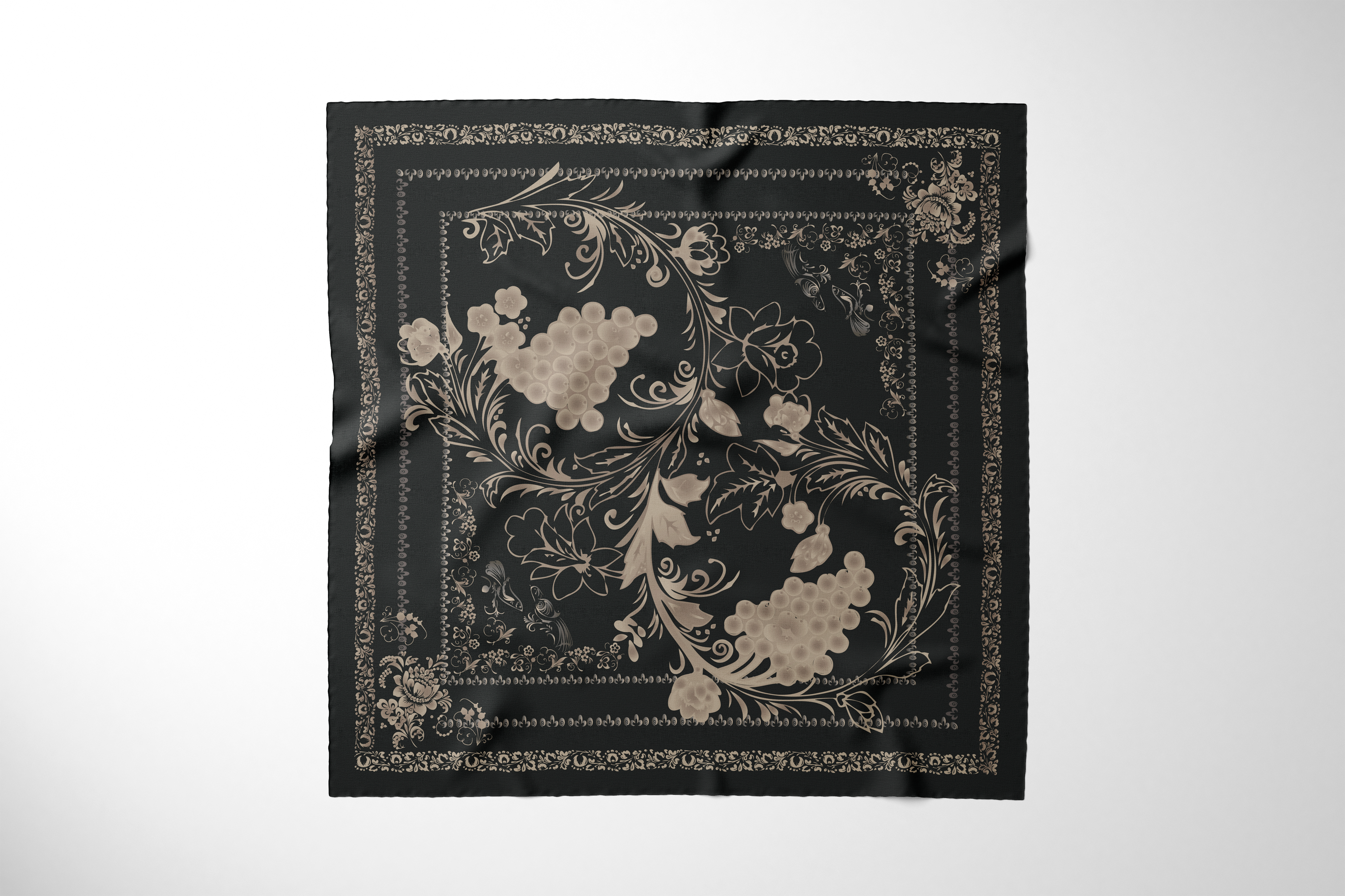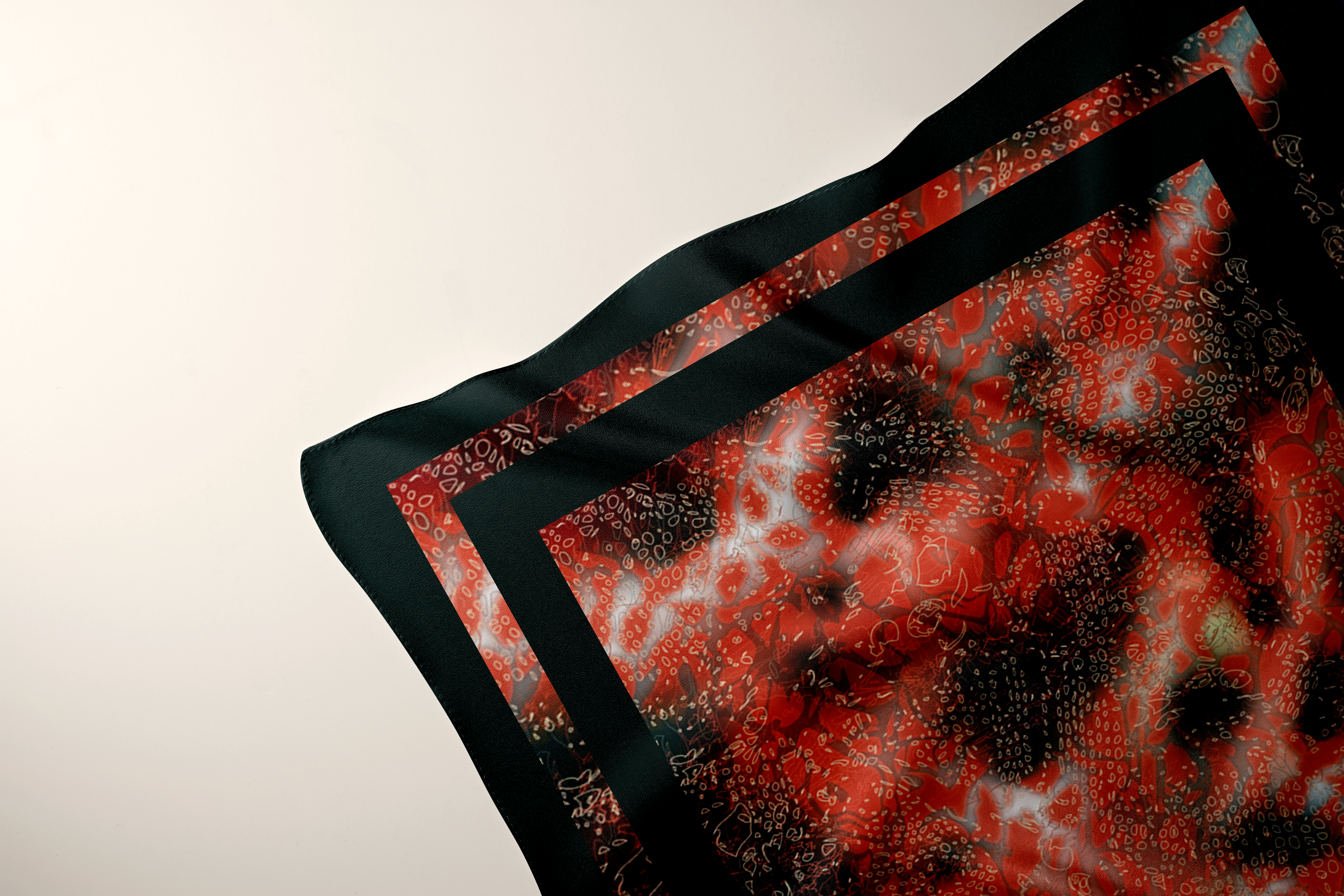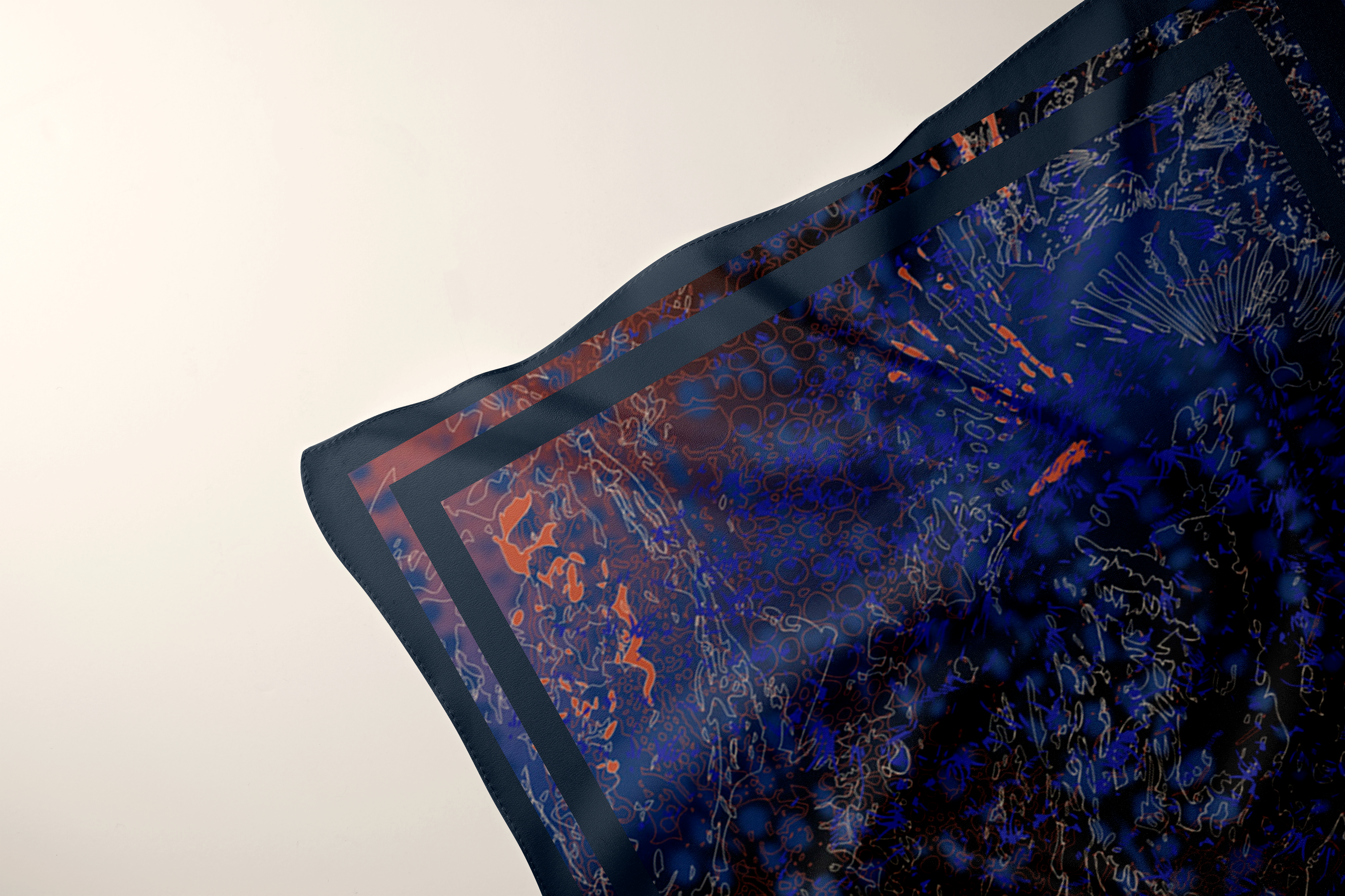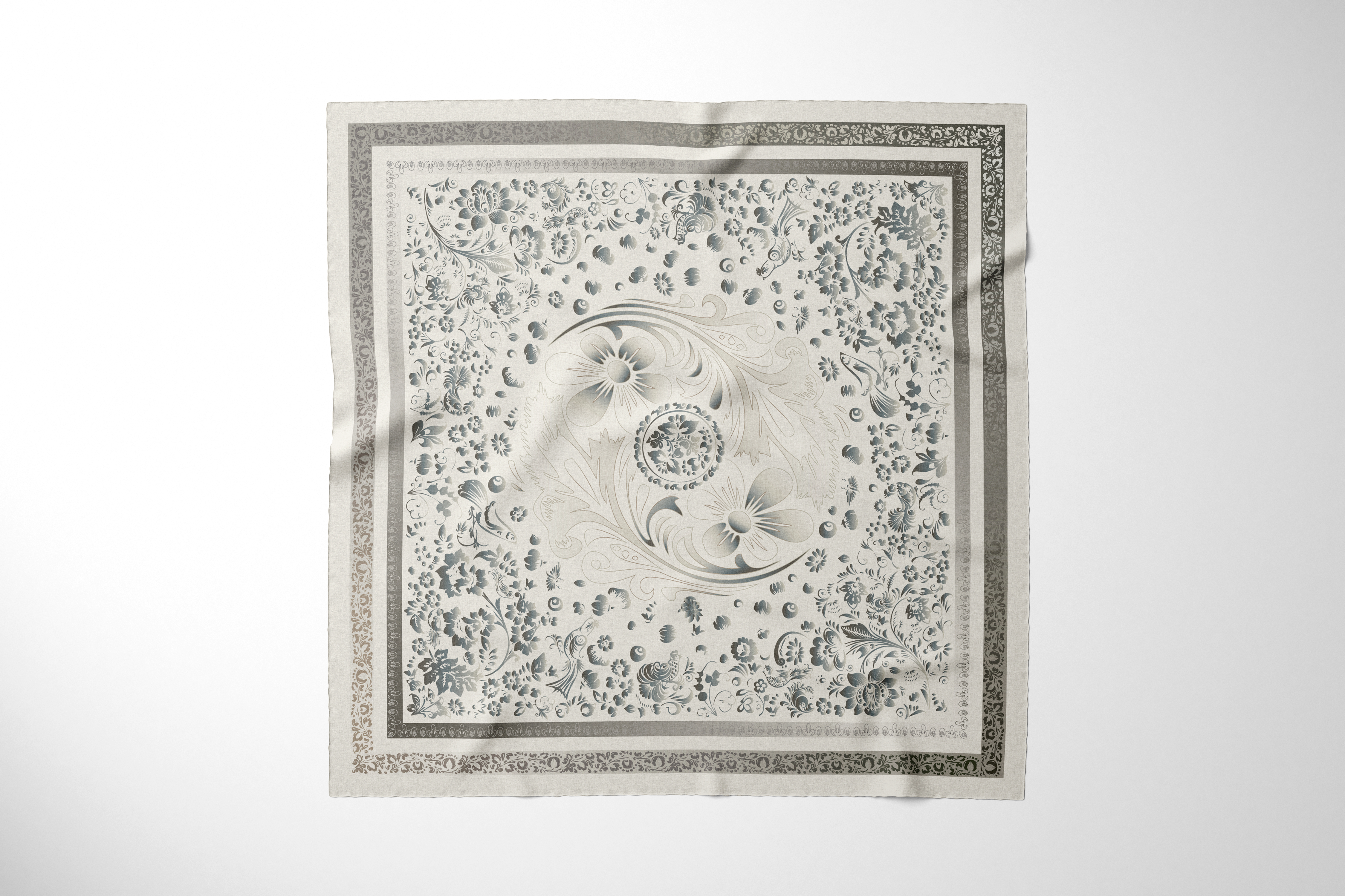 Концепция платков с традиционным орнаментом Якутии - выжженные леса, от которых остается лишь пыль и пепелище - аллегория на редеющие с каждым годом малочисленные народы нашей страны. Текстурированный градиент позволяет орнаменту то исчезать, то вновь складываться в целостное изображение - биение сердца народа.