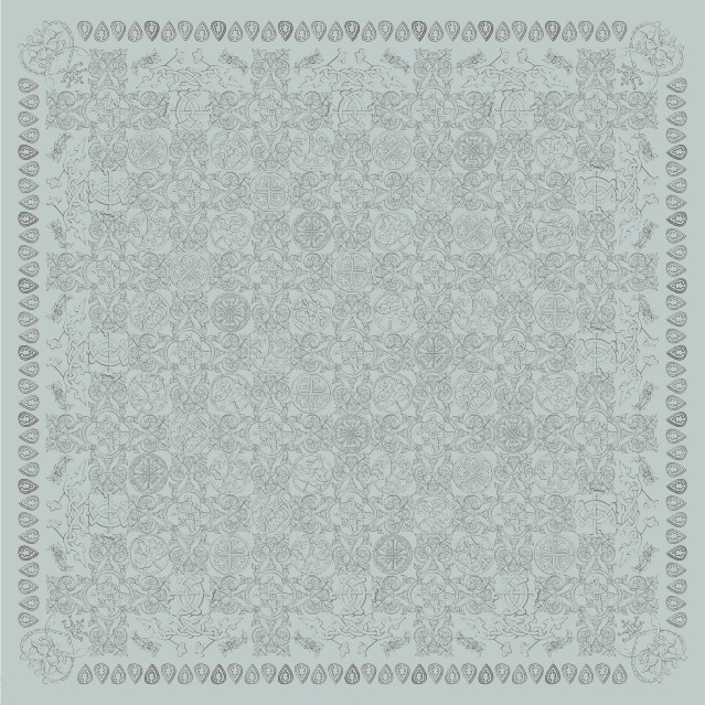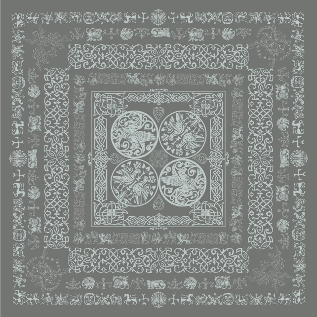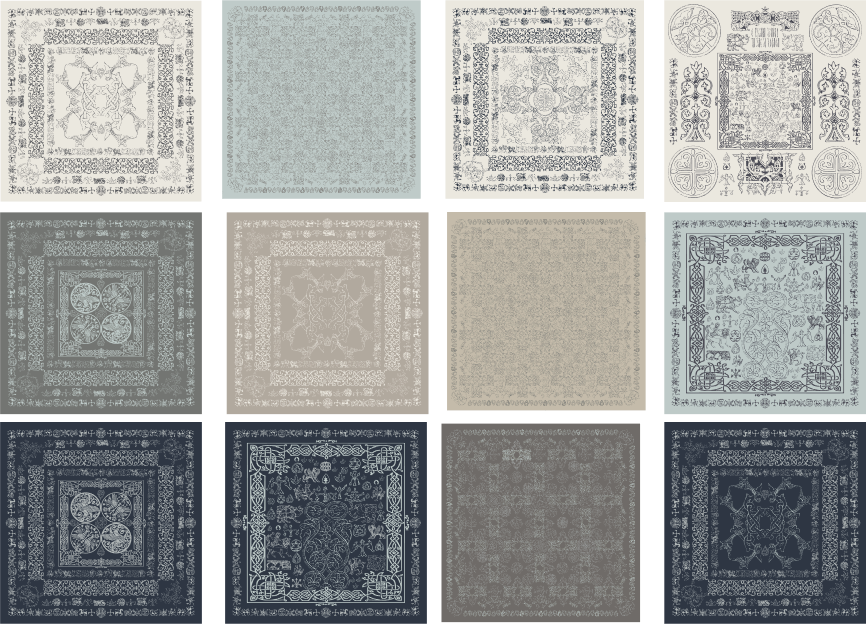 Узоры: Упрощённые фрагменты резьбы, адаптированные под текстиль. Акцент на зооморфных мотивах, в кайме будут использованы флоральные мотивы.
