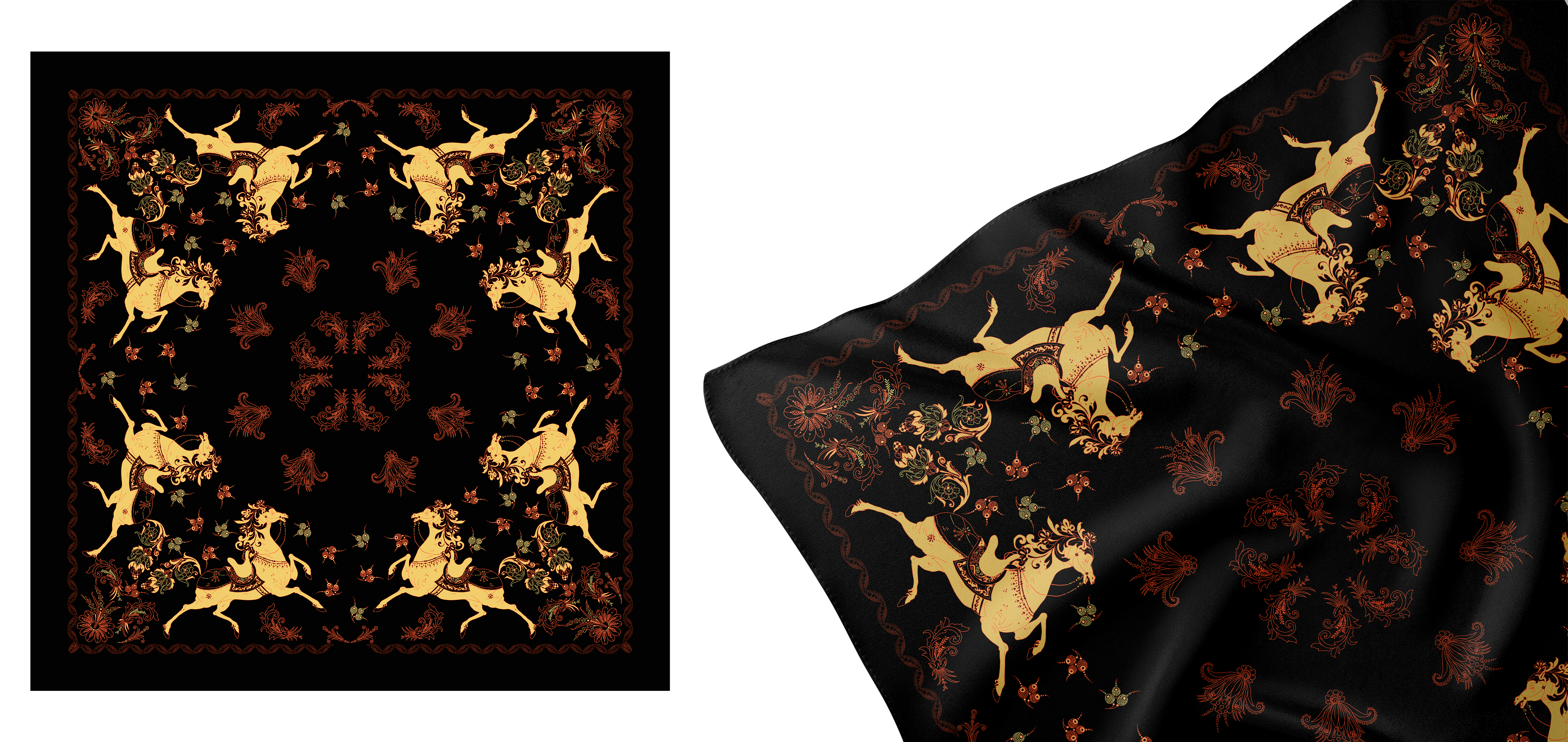 Композиция платка отрисована в графической программе Adobe Photoshop. За основу колористического решения были цвета Платок - отсылка на искусство города Городец с его полными движения конями. Для создания атмосферы праздника
