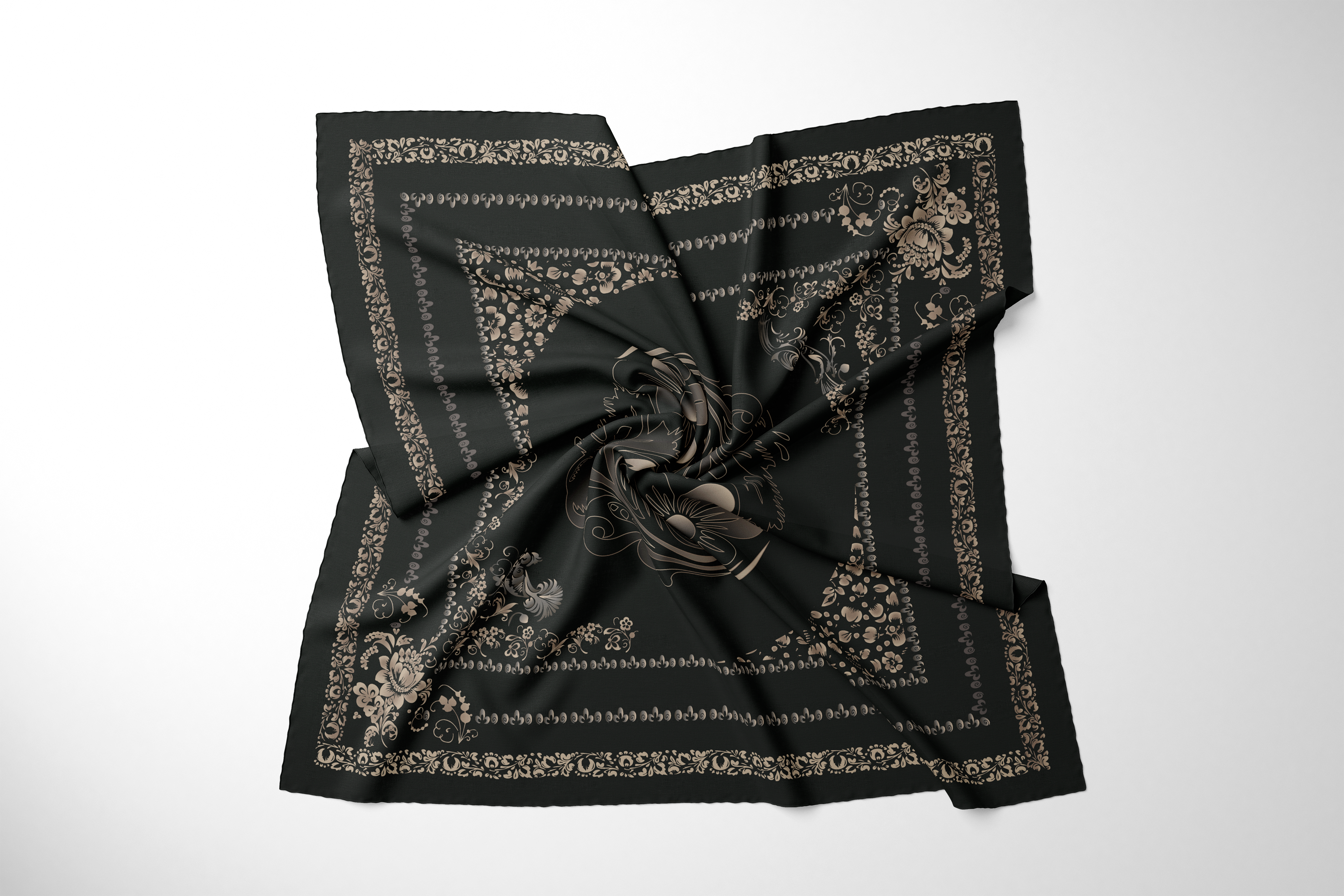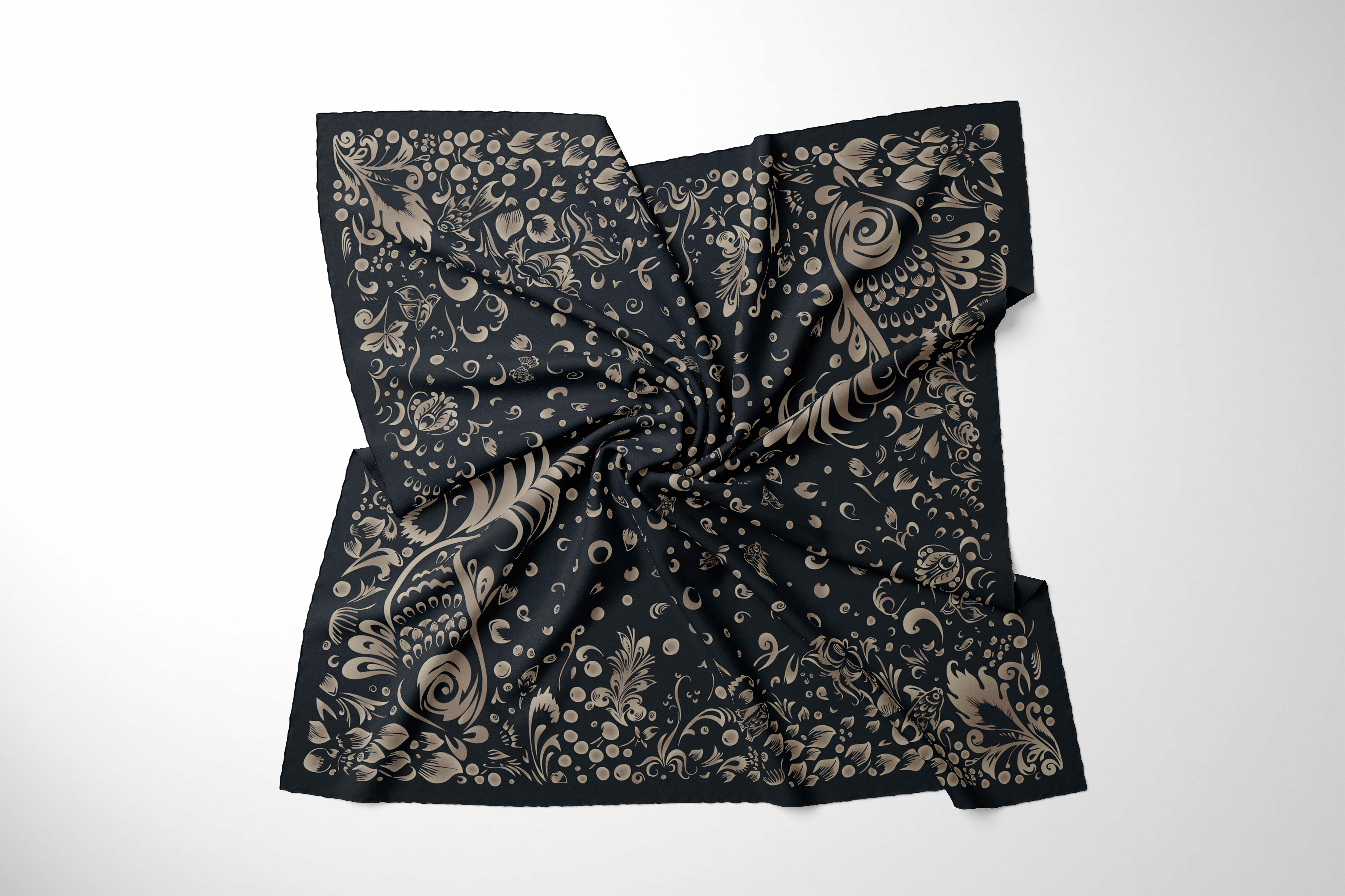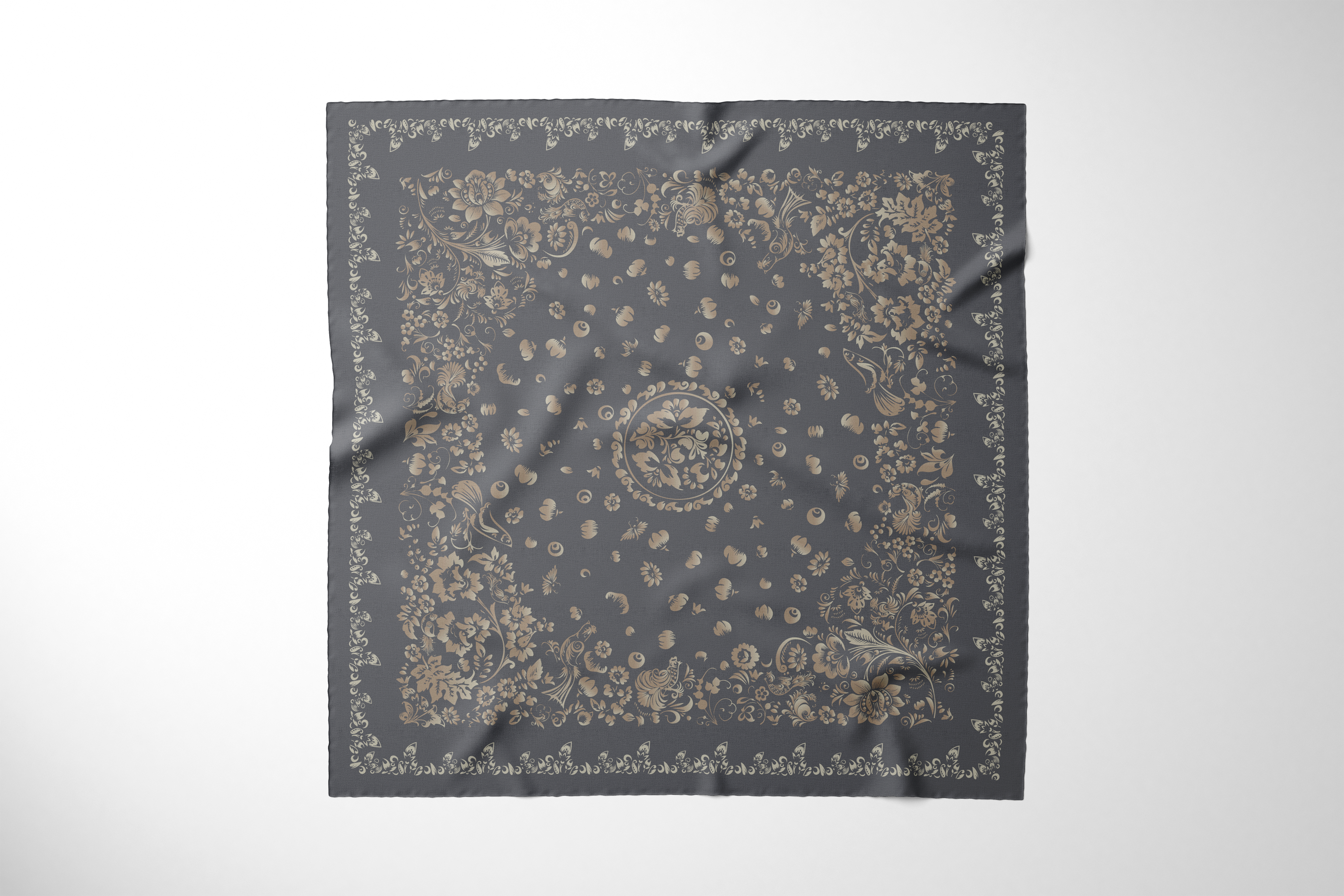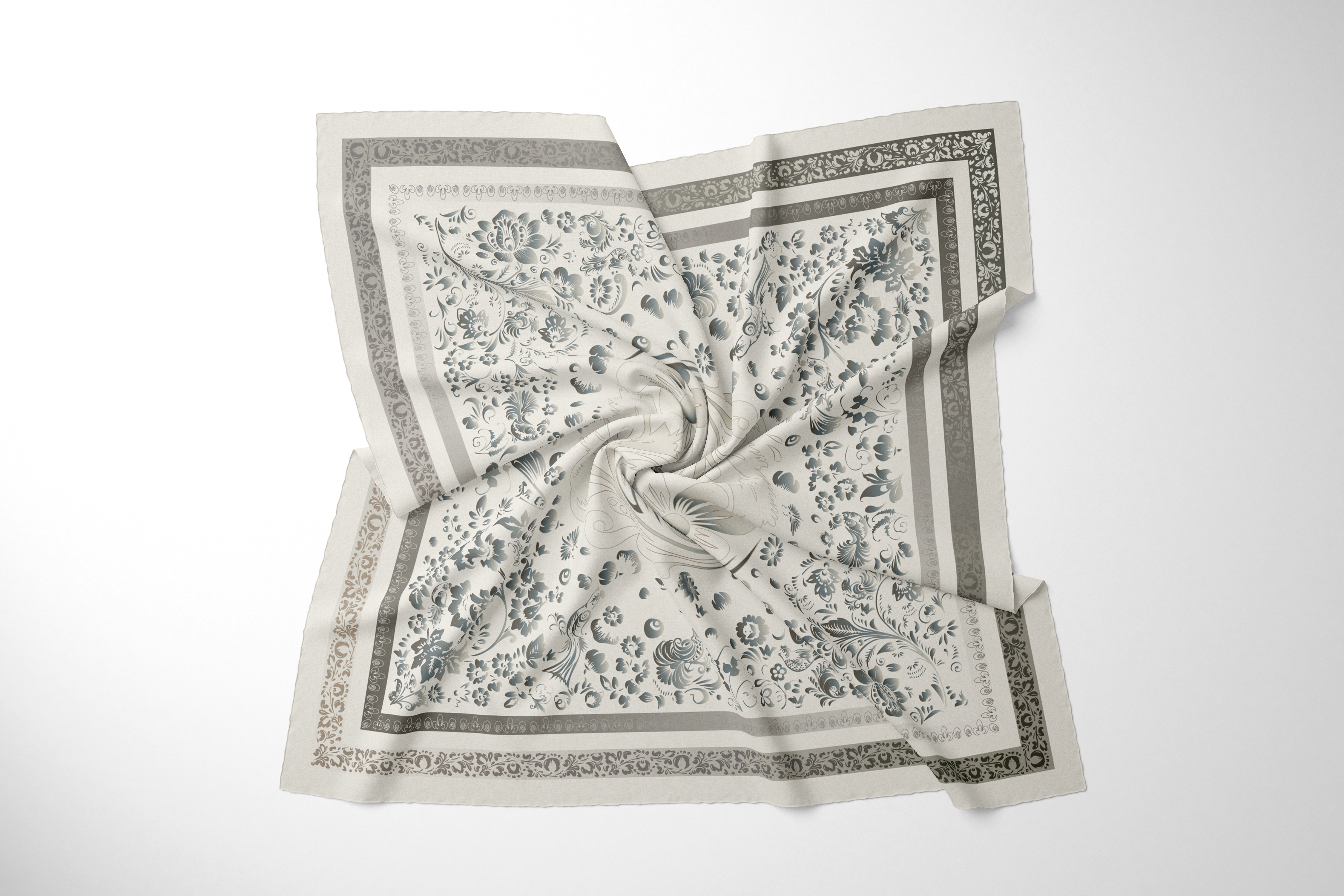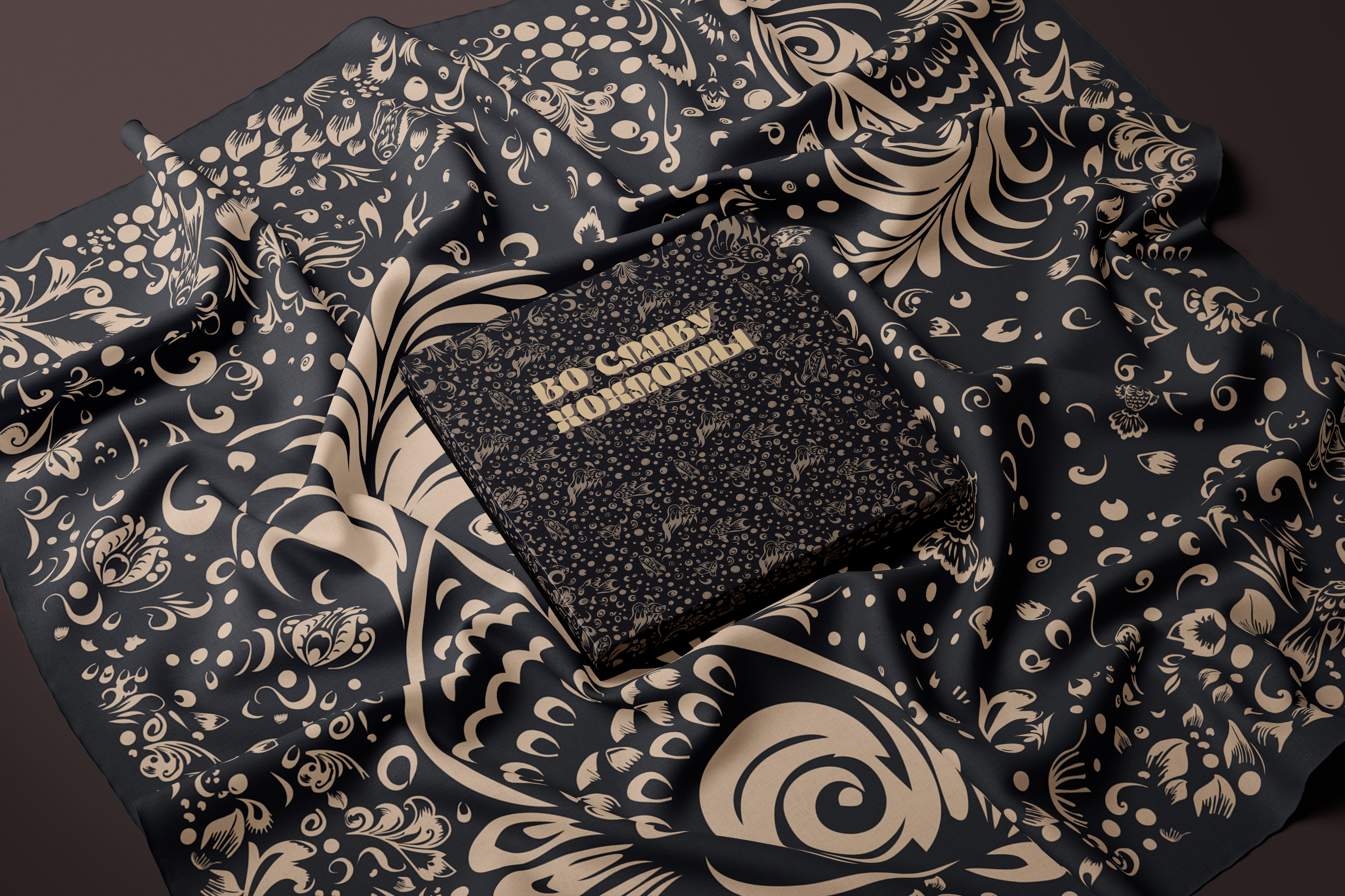 Основная идея коллекции “Во славу хохломы” - отдать дань русскому народному промыслу с его богатой историей, перенять культурный код и с ностальгией вспомнить о детстве. В работе над коллекцией были использованы документы из архивов выставок, посвященных хохломе, иллюстративные материалы предметов промысла из государственного каталога и отдельные тематические альбомы. Новое прочтение декоративно-прикладного искусства заключается в изменении цветовой гаммы на природные и нейтральные оттенки - апсидно-серый, градация бежевого, синевато-черный, жемчужно-белый, где акцентом служит контраст по цвето-тону. Отказ от традиционного колорита обусловлен стремлением интегрировать мотивы в современный текстиль. Узоры хохломы остались золотыми, однако предоставлены варианты композиций, где появился холодный отлив. В проектировании изделий применялся градиент с целью создания имитации кистевой росписи, эффекта блеска, тем самым сохранив истоки трепетного изготовления предметов знаменитого промысла. Коллекция условно подразделяется на 3 сюжета. “Райский сад”, где поют птицы счастья среди буйства цветов, “Золотые рыбки” словно из детской сказки, поднимающие из пучины морской ракушки, приносящие удачу.“ На стыке веков” - композиции с вписанным в геометрические фигуры орнаментом золотой хохломы с динамичным мотивом в центре “навь” и “явь” - аллюзия на ход времени. Представленные монокомпозиции могут применяться как аксессуары одежды - платки, как декор - текстильное настенное панно, скатерти, ковры и подушки. Раппорты могут участвовать как в дизайне одежды с мелким рисунком, так и в оформлении элементов декора. Золотая хохлома - это сплетение богатой истории, преемственности, мастерства, символизма, традиции и широкой русской души.